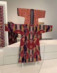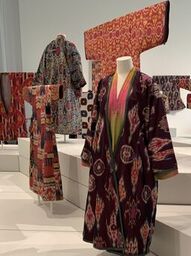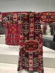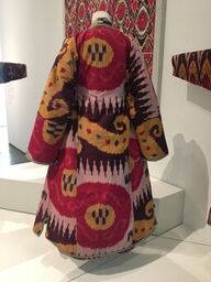 Ikats are made from resist dyeing where the pattern is dyed on threads in one direction before being woven. Each color must be dyed separately, so the more color, the more prestigious the garment is. The trim is integral to the robe and protects from evil spirits. Ikats were woven into both wall hangings and robes and are were produced in one piece. The robes were worn my both sexes and were usually layered over tunics or trousers resulting in a kaleidoscope of pattern on pattern.