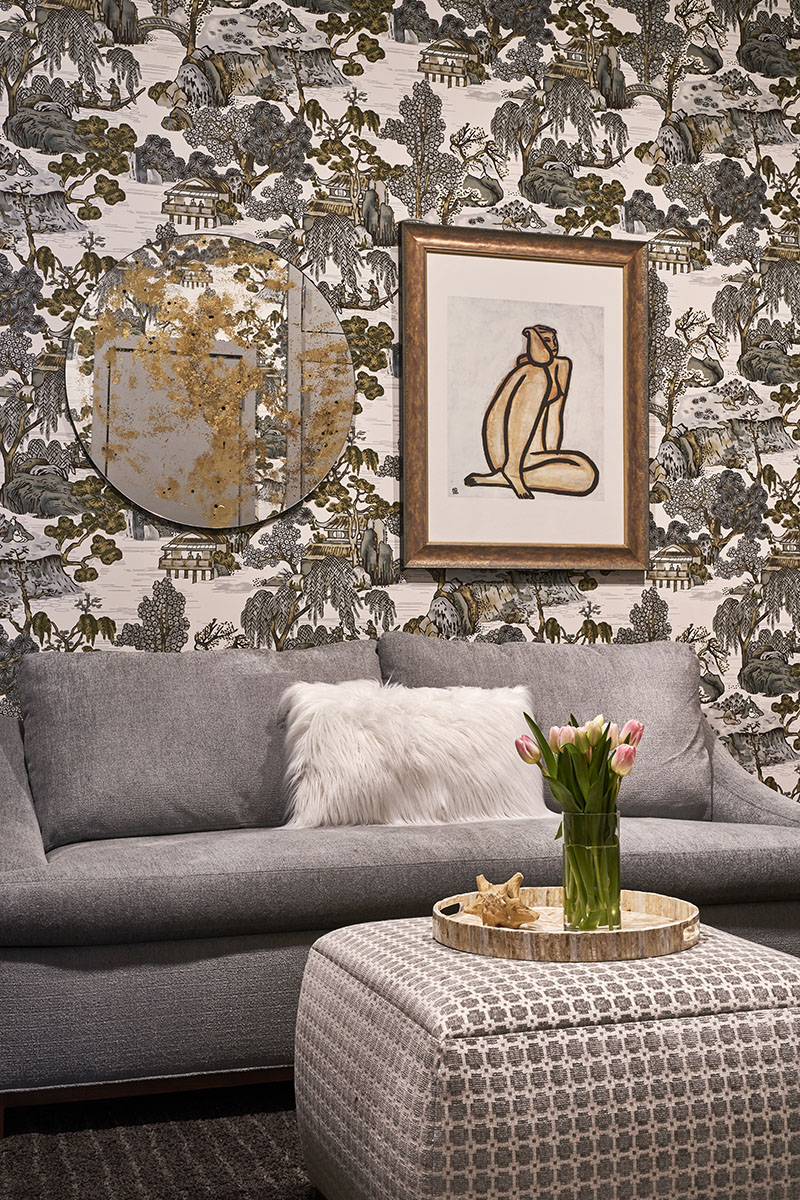 In the study, pictured, you will notice lots of texture and pattern. These layers provide a cozy, luxurious feeling. The ottoman offers a spot for games or to put your feet up. The rattan chair and small table are both light weight and can be easily be moved to include more people in the conversation. There is overhead lighting as well as both a floor and table lamp (not shown). All key ingredients to perfect comfort.