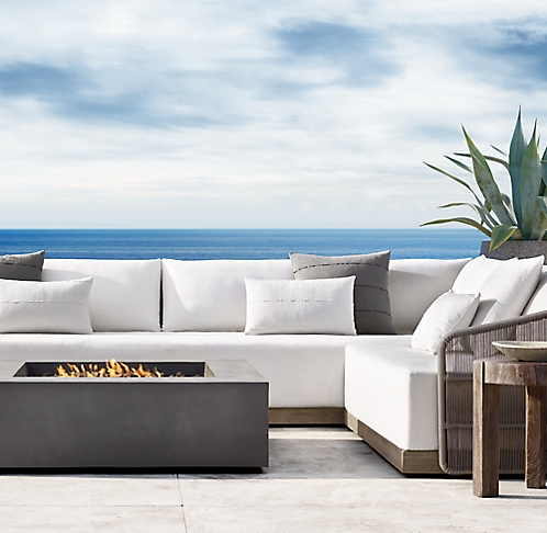 For the living area, my go-to is a sectional sofa with 2 end tables for drinks. Pop a fire pit close by for 3 season living.