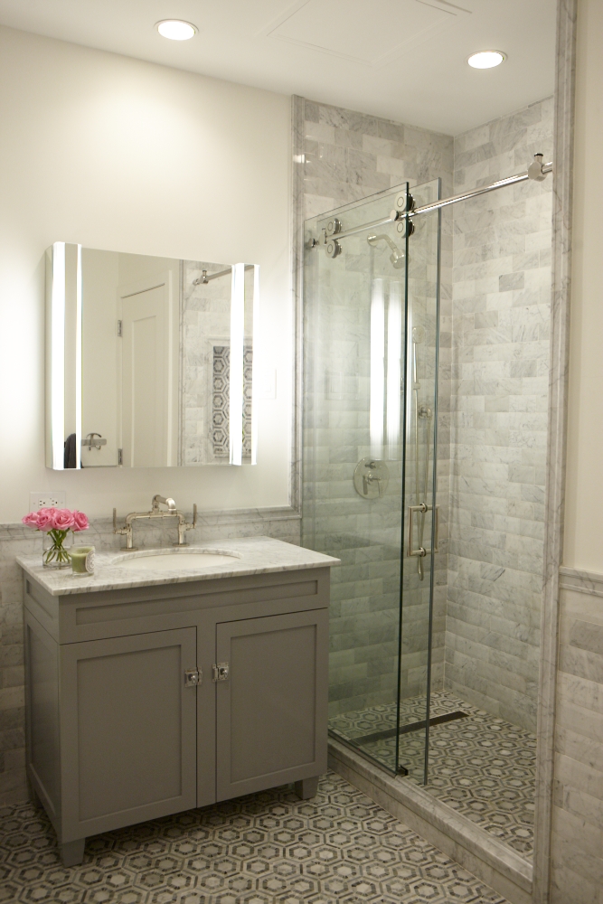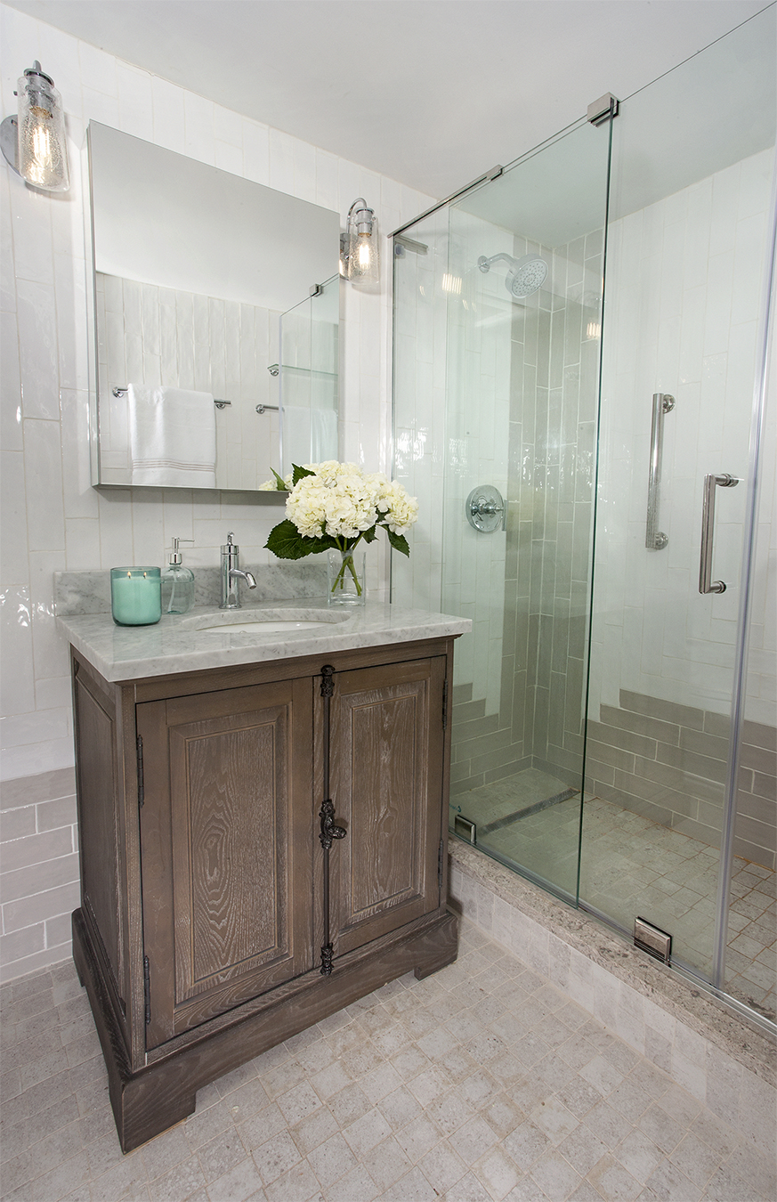 Changing a bathtub to a luxurious shower is a frequent request from my clients. There are a couple of key things to consider when planning this switch. Bathtubs are usually 30″ wide. This is a little narrow for most of us and you don’t want to bang your elbows on the glass when you’re washing your hair. Adding extra inches (6″-18″) will make your new shower much more comfortable and functional. I like to add a linear drain for more efficient drainage. Your shower doors will depend on the size of your bathroom. If space is tight, opt for sliding doors. Shower ‘barn doors’ are a great option.