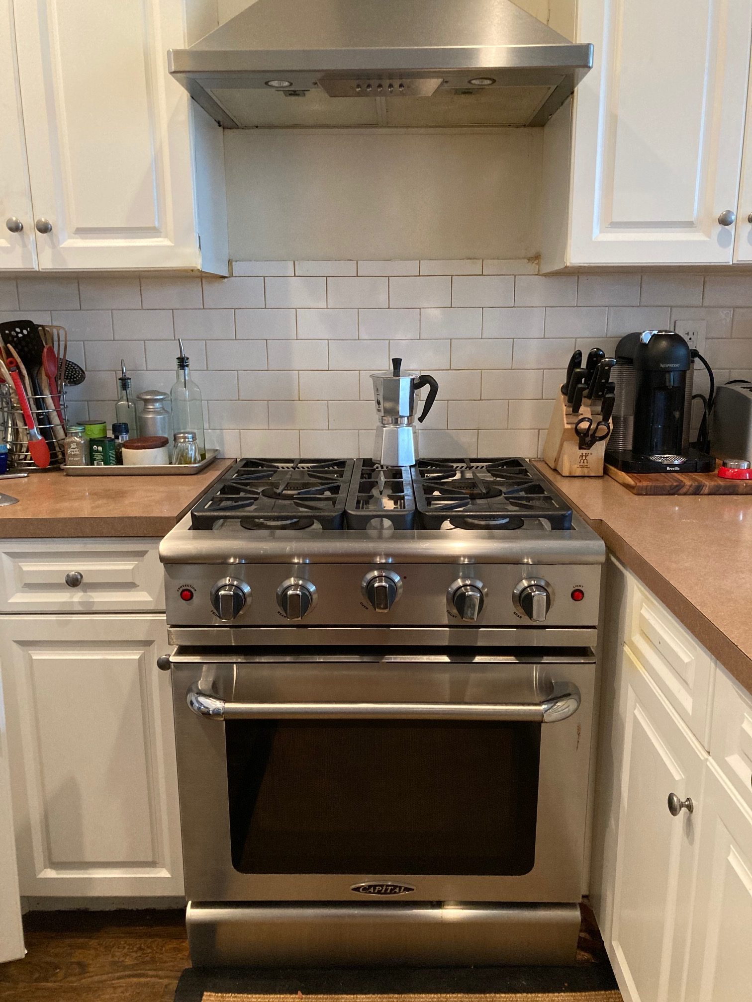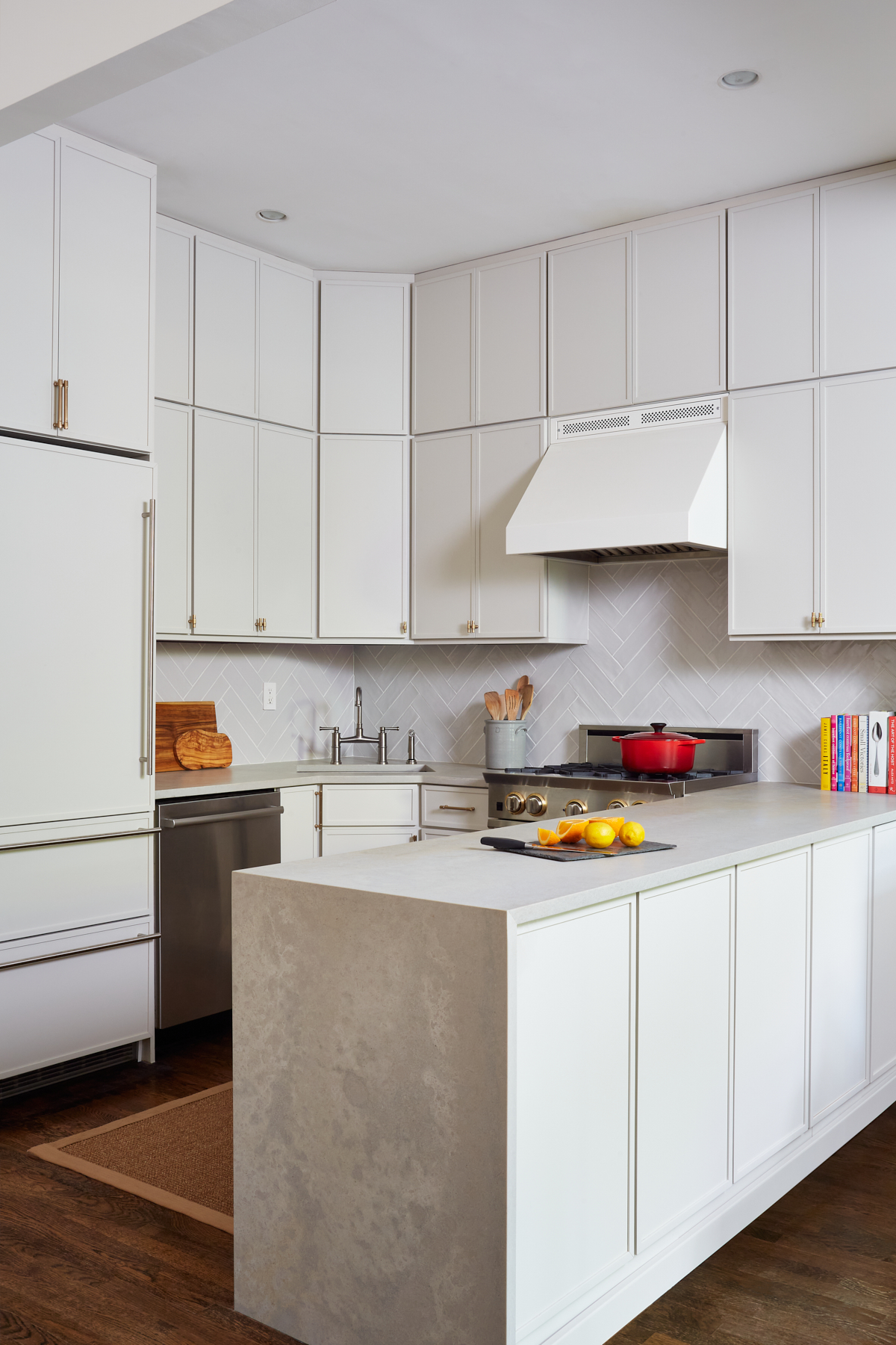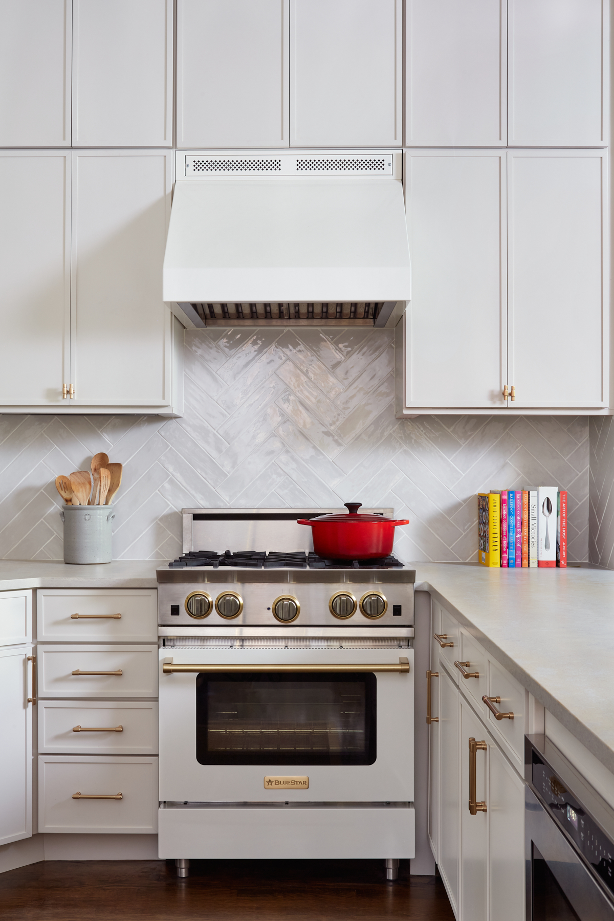 Our kitchen splurge was the Blue Star stove in a custom soft white enamel with antique brass accents. The wood cabinets are painted in Irish Cream. There is a mix of stainless and brass hardware as we didn’t want it to read ‘trendy’. The rippled backsplash tiles are laid in a herringbone pattern. The Caesarstone countertop in a mix of neutrals has a gorgeous waterfall end.