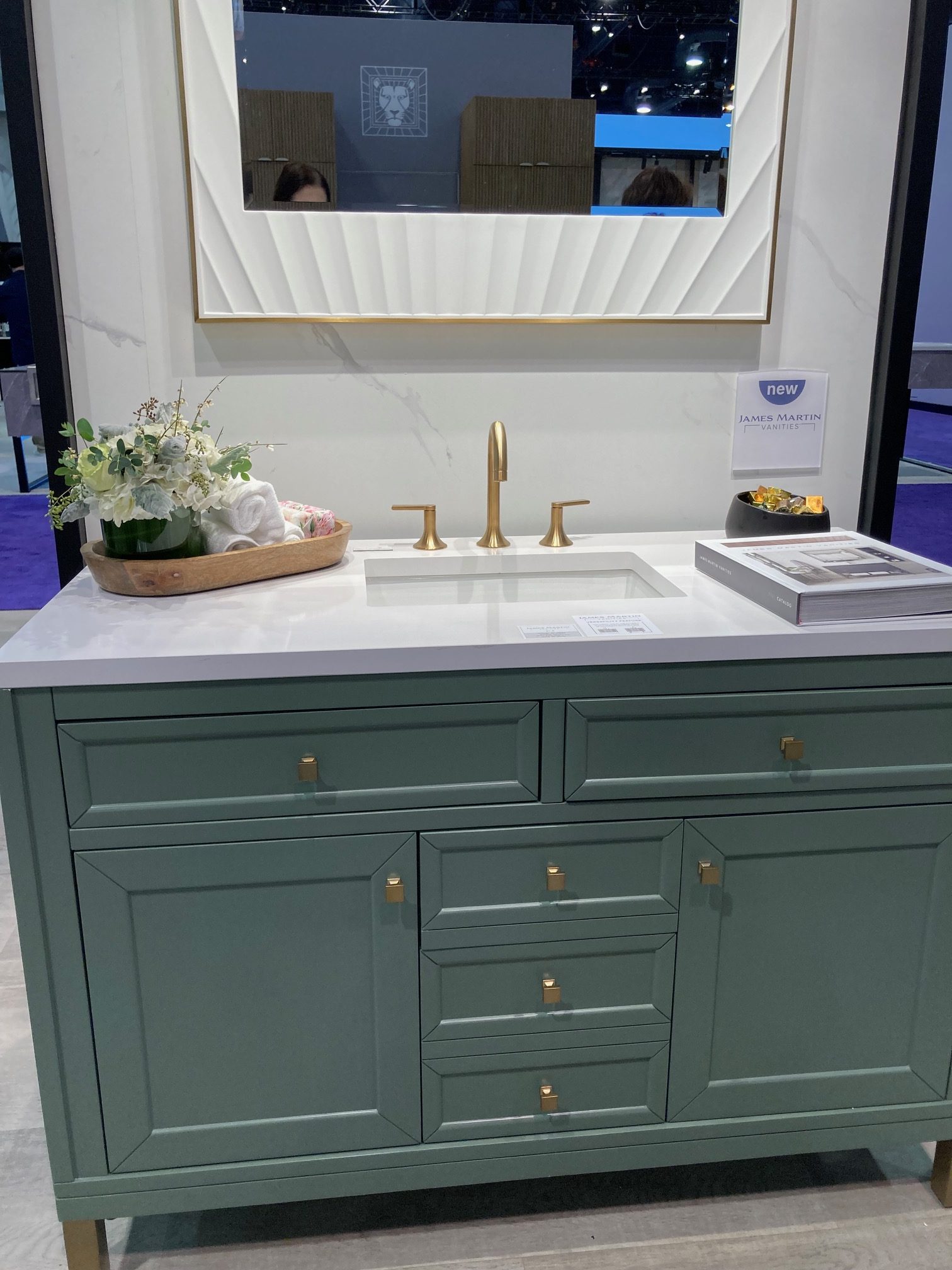 The Statement Vanity- Most bathroom vanities were shown in light wood tones with solid surface white or pale grey tops. These offer a calm counterpoint to the abundance of color elsewhere. However, if you have your heart set on a color, there are many beautiful blue and green tones to choose from.